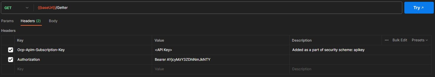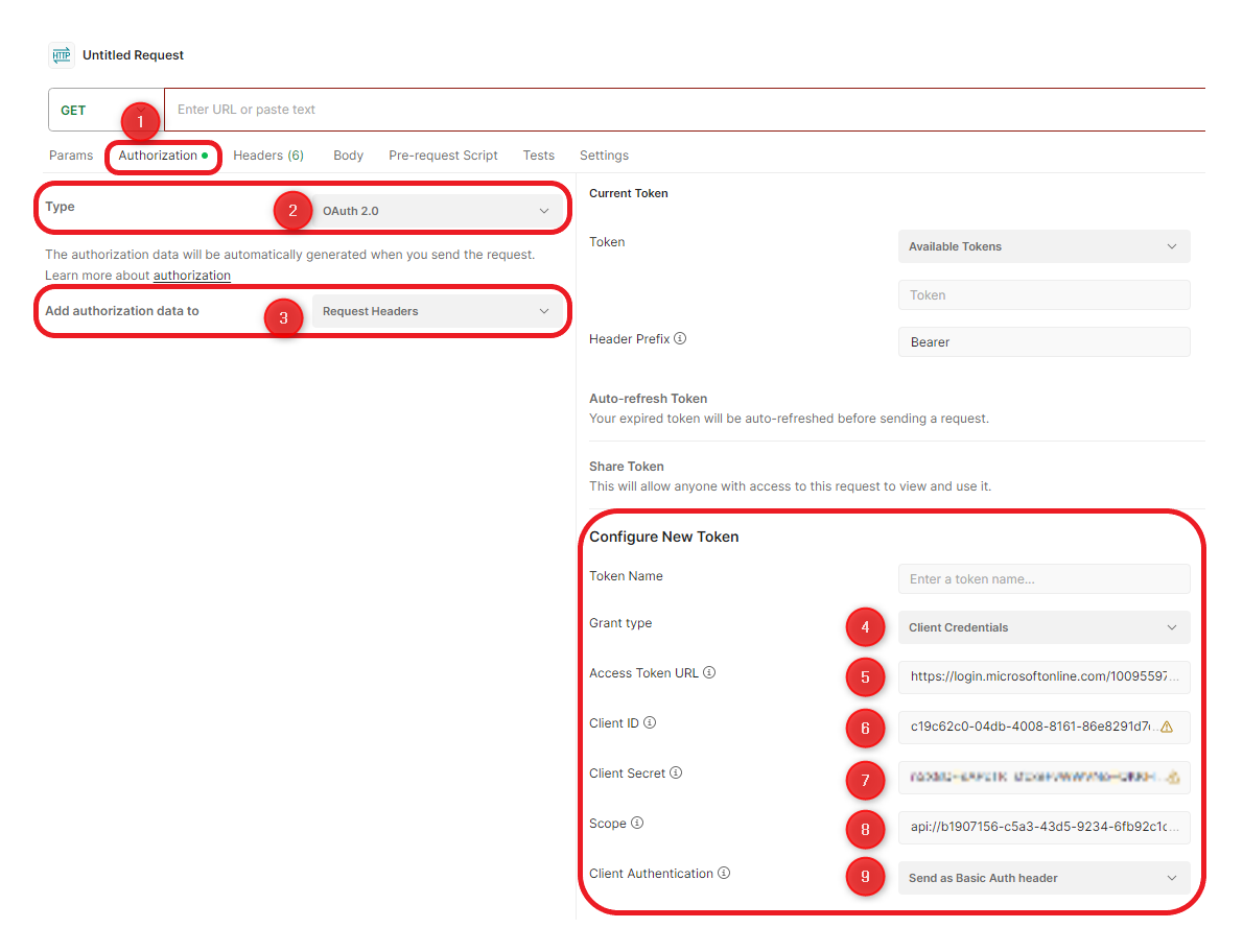 e.g. api://64e0b58f-4652-47a3-a7eb-63a4d59f5dd7/.defaultClient Authentication = Send as Basic Auth header