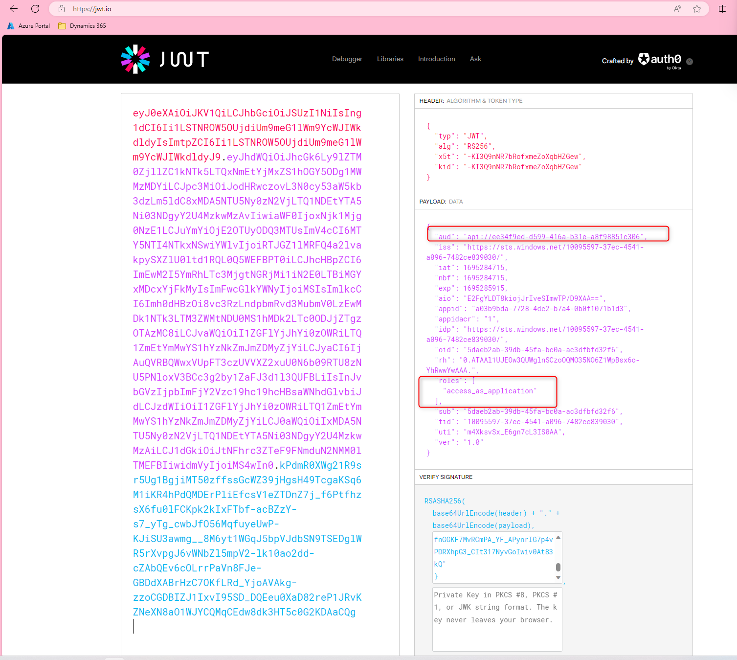You can now copy the content from "Access Token" and validate it with e.g. jwt.io to verify you have the correct role assignments in the scope section for your backend: